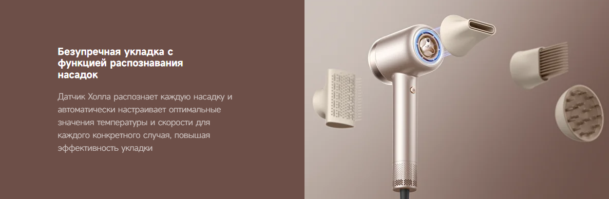 В комплект входят 4 насадки, включая диффузор и концентратор. Это позволяет создавать как объёмные, так и более точные укладки в зависимости от типа волос и желаемого результата.